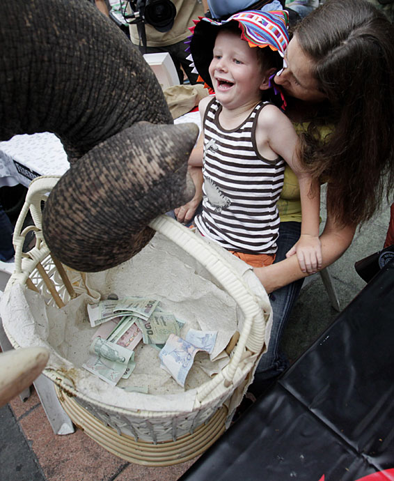 1月21日,在泰國(guó)首都曼谷舉辦了一場(chǎng)大象為海地災(zāi)區(qū)募捐活動(dòng)。人們紛紛向大象攜帶的籃子內(nèi)放入善款,向海地地震幸存者獻(xiàn)上一份愛心。圖片來源:中國(guó)新聞網(wǎng)