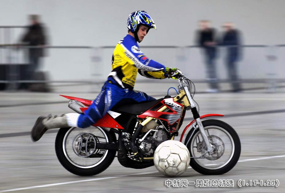 1月22日,國際摩托車貿(mào)易博覽會上,一場名為“魅力摩托”的足球比賽吸引了眾人的目光,參賽者駕駛摩托的同時還不忘將足球送入對方的大門。 圖片來源:中國新聞網(wǎng)>>點擊觀看詳細內(nèi)容