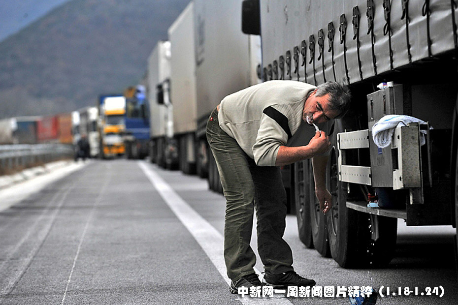 1月21日,一名卡車司機(jī)在希臘-保加利亞邊境的一個岔道口刷牙。希臘農(nóng)民封堵了道路,要求國家提供救助以彌補(bǔ)農(nóng)產(chǎn)品價格偏低帶來的損失。圖片來源:中國新聞網(wǎng)