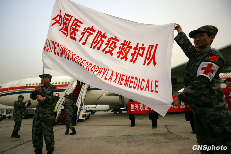 1月24日18時,由中國人民解放軍醫(yī)護人員和管理人員組成的中國醫(yī)療防疫救護隊一行40人乘坐軍運包機離開北京,啟程前往海地進行人道主義救援任務(wù)。
