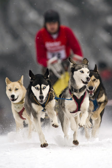 圖為參賽者與雪橇犬在比賽中。