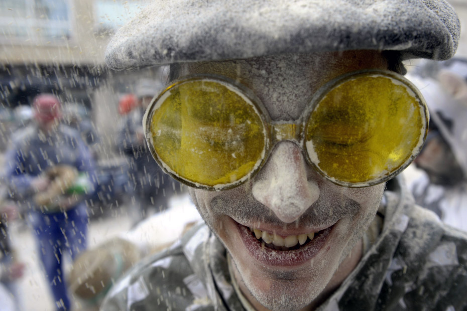 圖為人們參加狂歡節(jié)“面粉大戰(zhàn)”。