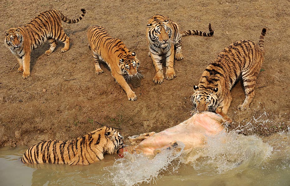 但水中的牦牛一動(dòng)彈,更加激發(fā)了老虎的野性,這時(shí)有三、四只老虎撲了上來,工作人員拼命往水塘邊上拽牦牛,無奈一只虎王一下就咬住了牦牛的脖子怎么都不肯松口,繼而上演了人和老虎的“拔河比賽”。
