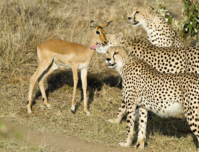 據(jù)英國媒體28日?qǐng)?bào)道,一名在肯尼亞野生動(dòng)物保護(hù)區(qū)拍照的攝影師拍到令人驚訝的畫面:三只獵豹與一只本是其獵物的小羚羊竟然和睦相處,共同嬉戲玩鬧,完全沒有危險(xiǎn)“天敵”的概念。小羚羊最終毫發(fā)無傷地逃生成功。