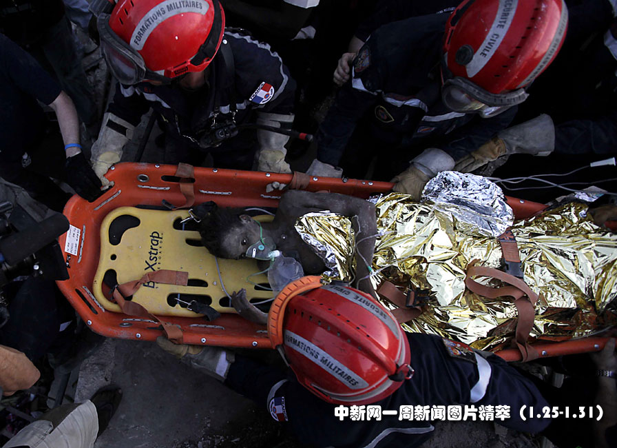 1月27日(周三),法國搜救隊從海地太子港的廢墟中救出一名少女,這名少女埋在廢墟中已超過兩周時間。圖片來源:中國新聞網(wǎng)