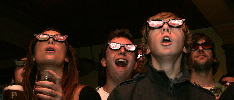 圖為球迷在倫敦的酒吧里享受3D足球直播。北京時間2月1日,英國體育頻道首次使用3D技術對阿森納與曼聯(lián)的比賽進行電視直播。據(jù)悉,今年南非世界杯也將進行3D轉播。