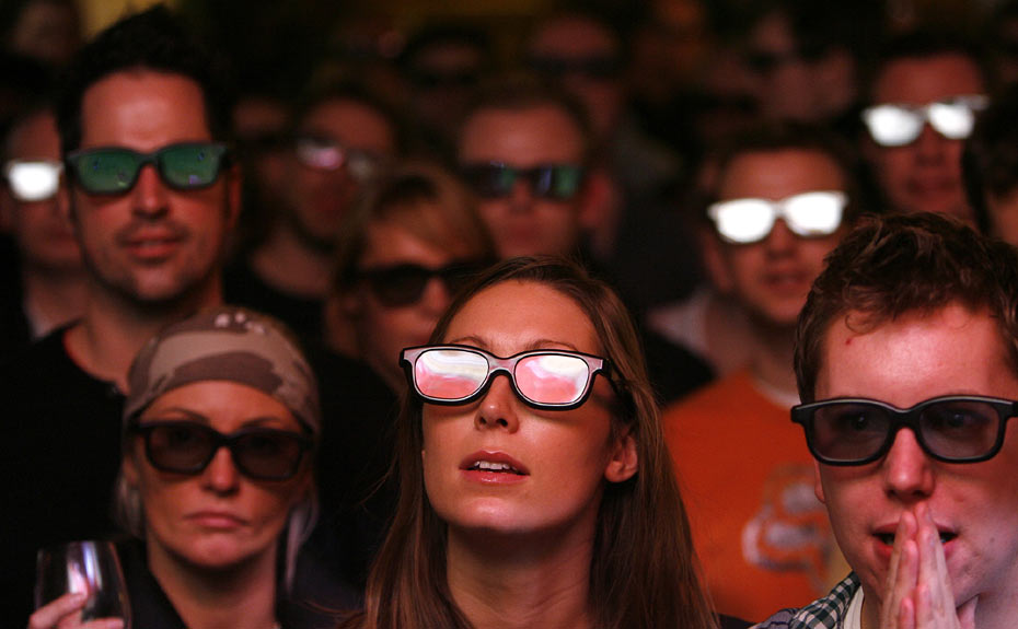 圖為球迷在倫敦的酒吧里享受3D足球直播。北京時間2月1日,英國體育頻道首次使用3D技術(shù)對阿森納與曼聯(lián)的比賽進行電視直播。據(jù)悉,今年南非世界杯也將進行3D轉(zhuǎn)播。