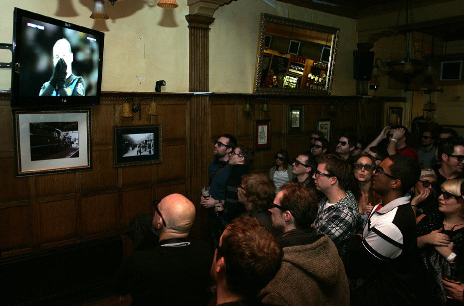 圖為球迷在倫敦的酒吧里享受3D足球直播。北京時(shí)間2月1日,英國(guó)體育頻道首次使用3D技術(shù)對(duì)阿森納與曼聯(lián)的比賽進(jìn)行電視直播。據(jù)悉,今年南非世界杯也將進(jìn)行3D轉(zhuǎn)播。