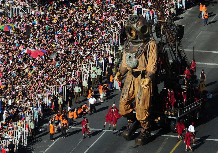 近日,智利首都圣地亞哥街頭,法國一劇團(tuán)攜巨型提線木偶“小巨人”上街表演,它惟妙惟肖的表情和逼真的神態(tài)引得周圍觀眾的陣陣掌聲。圖片來源:中國新聞網(wǎng)