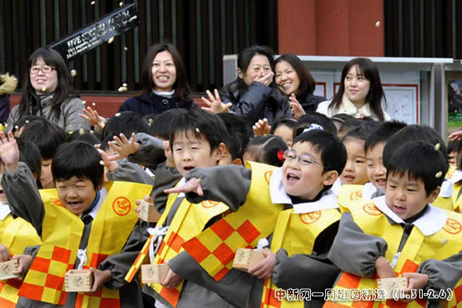 2月3日,日本首都東京,幼兒園小朋友們?cè)凇肮?jié)分”的撒豆驅(qū)邪儀式上投擲大豆。圖片來源:中國新聞網(wǎng)>>點(diǎn)擊觀看詳細(xì)內(nèi)容