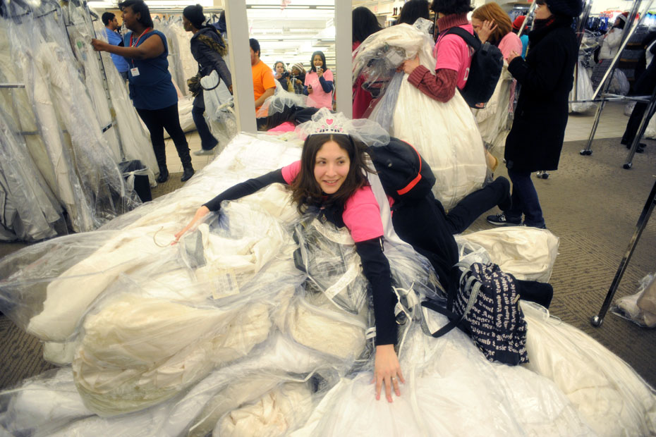 近日,美國紐約一年一度的“新娘快跑”婚紗促銷活動舉行。千余名來自全美各地的準新娘和親朋好友,早早就在門口等候,平時上千美元婚紗只需要五分之一的價格就能帶回家。圖片來源:中國新聞網(wǎng)