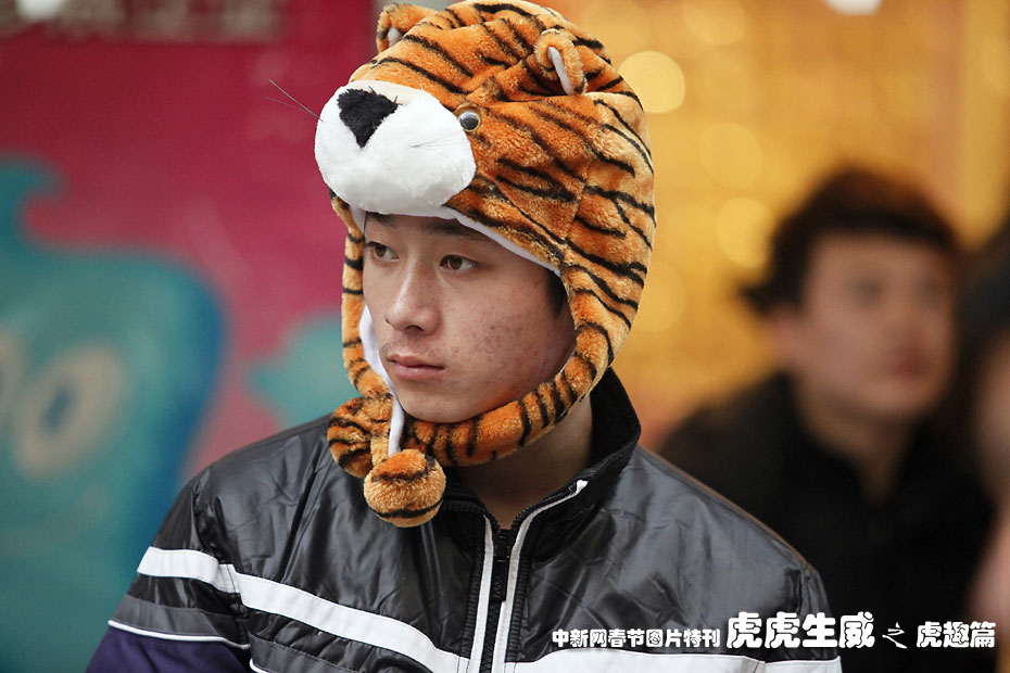 2月4日,上海人們頭戴虎帽迎接新年的到來。