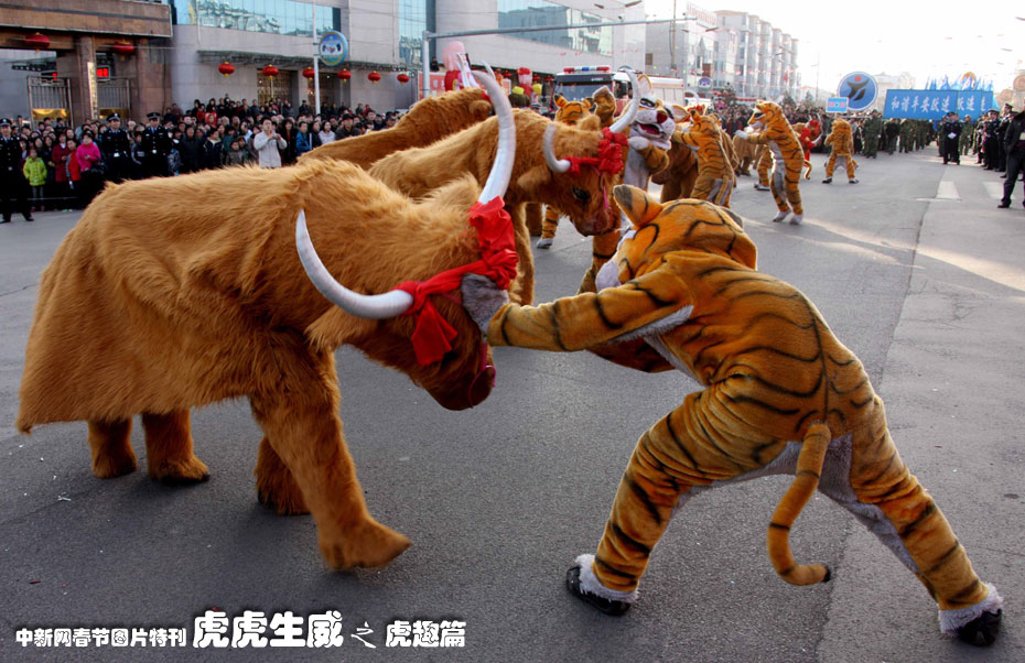 2月10日是正月十六,山西省盂縣舉辦《金牛鬧春》大型街頭春節(jié)文化活動(dòng)節(jié)目展演,為現(xiàn)場5萬余名觀眾奉上了一場豐盛的元宵節(jié)文化大餐。盂縣西小坪村的旱船和東城武村的腦閣及石店煤礦的牛逗虎是展演活動(dòng)中的三項(xiàng)非物質(zhì)文化遺產(chǎn)保護(hù)項(xiàng)目,是最有特色的民間紅火形式之一,它不僅歷史悠久,而且因?yàn)榈谰咴煨酮?dú)特,表演套路豐富,音樂伴奏喜慶熱烈而受歡迎。中新社發(fā) 程瑜 攝