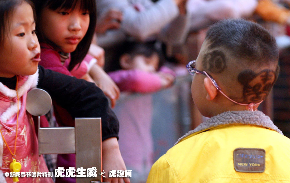 中國傳統(tǒng)新年虎年將至,北京隨處可見以虎為主題的各種雕塑、繪畫以及裝飾、禮品。圖為近日北京一名小朋友以最新潮的“小老虎頭”亮相顯得別具新意。中新社發(fā) 錢興強 攝