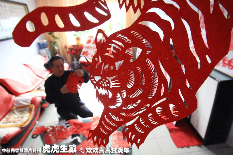 2月1日,已有56年剪紙經(jīng)驗的新疆奇臺縣71歲民間剪紙藝人李萬發(fā)正在家中精心剪裁各類虎圖案,準備贈與親朋好友。中國農(nóng)歷新年即將到來,新疆各地以各種方式迎接農(nóng)歷虎年的到來。中新社發(fā) 劉新 攝