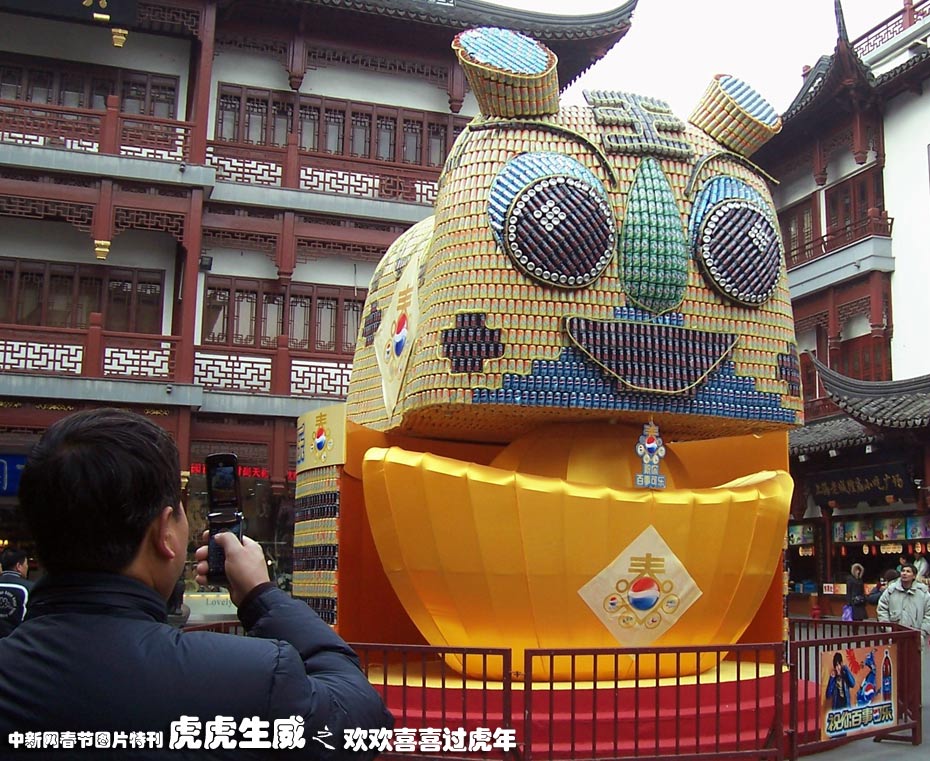 1月5日,一只用數(shù)萬個易拉罐搭成的高達七米的卡通虎亮相上海豫園商城廣場,迎接虎年新春的到來,吸引中外游客觀賞留影。中新社發(fā) 周東潮 攝
