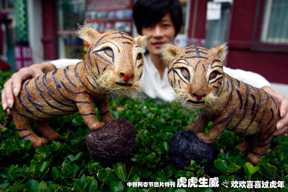 2009年11月9日,北京一位時尚發(fā)型設計師正在展示頭發(fā)絲作品“福虎神威”賀歲虎年。這是祖國60華誕之后的又一新作,四川青年理發(fā)師黃鑫用2.6公斤碎頭發(fā)制作了一對可愛逼真的“;ⅰ,歷時兩個多月的時間才完工。中新社發(fā) 鄭雄增 攝