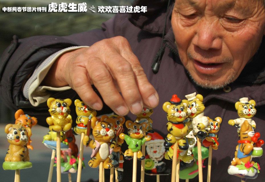 2009年12月5日,民間藝人孟爾珍在整理捏制的面“虎”;⒛昙磳(lái)臨,74歲的江蘇揚(yáng)州民間面塑藝人孟爾珍捏制出許多神態(tài)各異的面“虎”臨街售賣。這種由面粉、香油、蜂蜜、甘油等近十種配料做成的面“虎”,深受孩子和年輕人的喜愛(ài)。 中新社發(fā) 張丙濤 攝