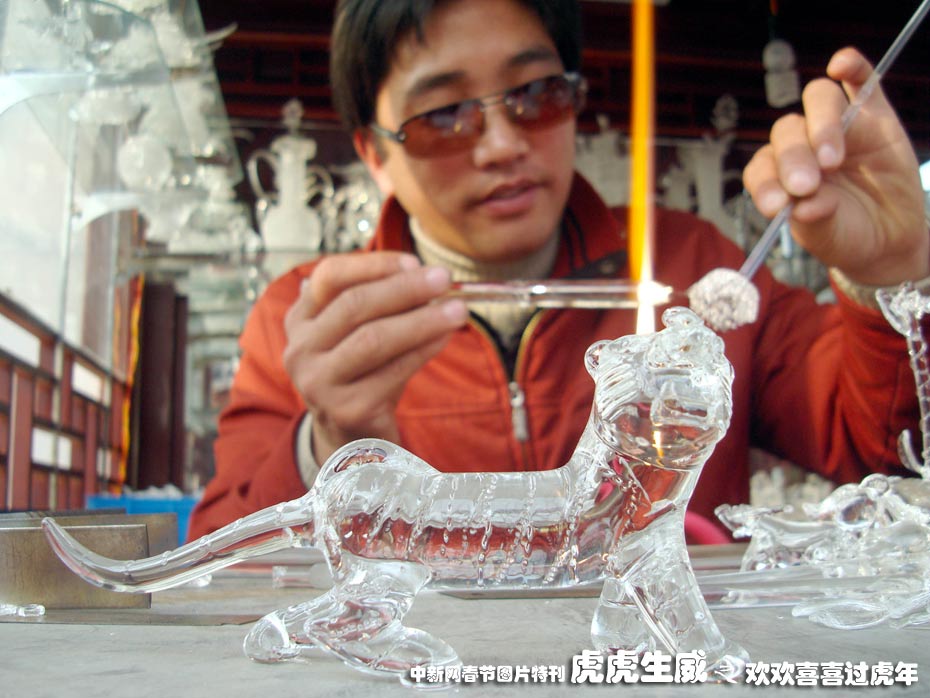 1月29日,蘇州市民間藝人馬強在工藝亭里利用玻璃拉絲絕技燒制而成的生肖虎飾品,造型逼真,吸引了眾多游人的目光。中新社發(fā) 王建康 攝