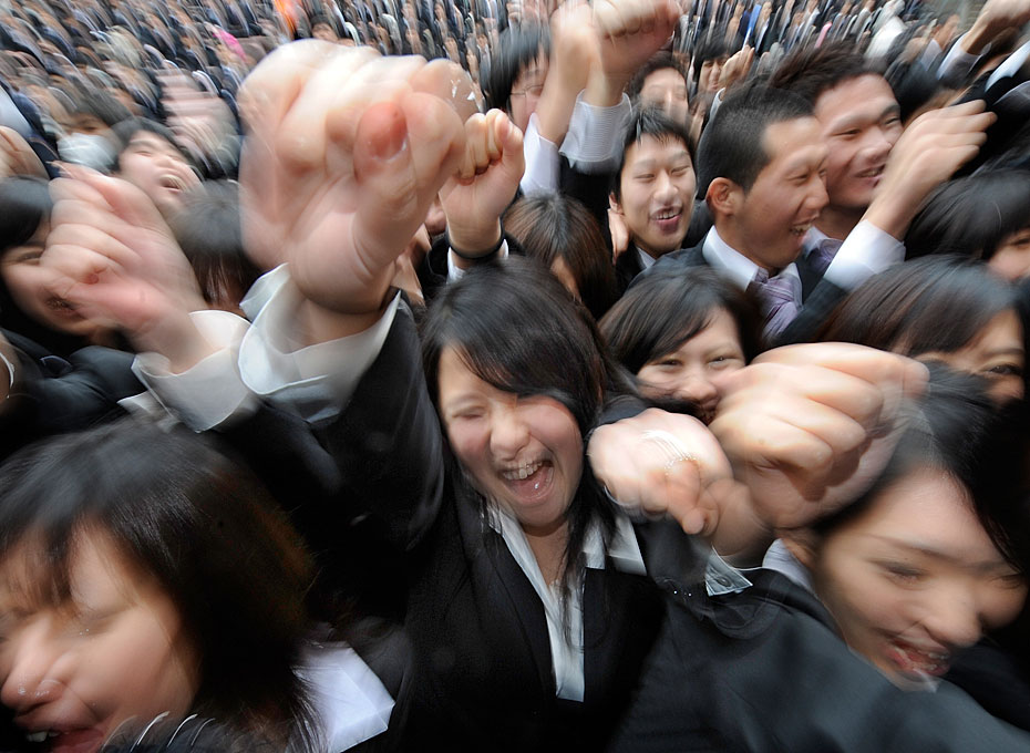 2月10日,日本東京職業(yè)學(xué)校的學(xué)生在求職動員會上伸出拳頭展現(xiàn)信心。日本的失業(yè)率達5%,2011屆畢業(yè)生將面臨嚴峻就業(yè)形式。圖片來源:中國新聞網(wǎng)