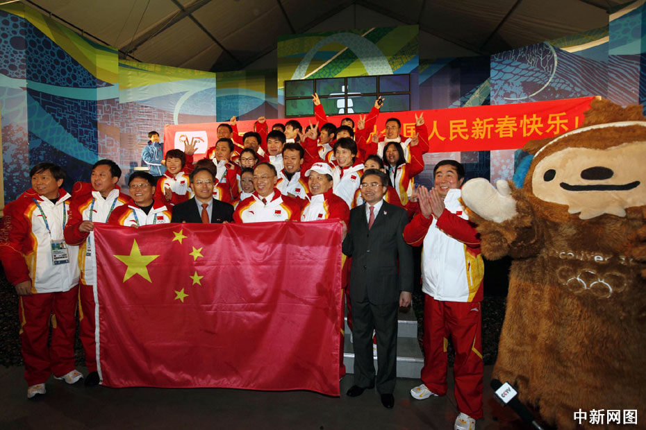 當(dāng)?shù)貢r(shí)間2月10日,中國代表團(tuán)在溫哥華冬奧會奧運(yùn)村舉行升旗儀式。升旗儀式結(jié)束后,中國代表團(tuán)團(tuán)長劉鵬帶領(lǐng)代表團(tuán)成員展開橫幅高聲向全體國人送上新春祝福。中新社記者 盛佳鵬 攝