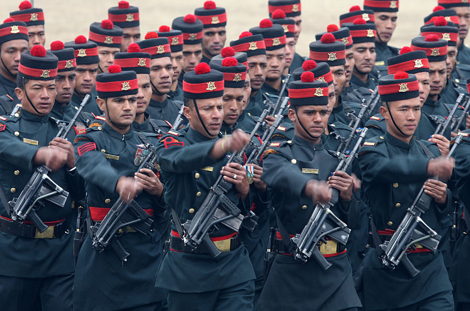 當(dāng)?shù)貢r(shí)間2月12日,尼泊爾士兵在首都加德滿都舉行了建軍節(jié)閱兵式。尼泊爾總統(tǒng)和總參謀長檢閱了受閱部隊(duì)。圖片來源:中國新聞網(wǎng)
