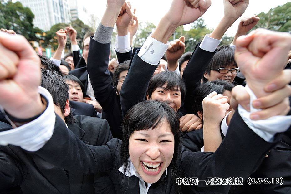 2月10日,日本東京職業(yè)學(xué)校的學(xué)生在求職動(dòng)員會(huì)上伸出拳頭展現(xiàn)信心。日本的失業(yè)率達(dá)5%,2011屆畢業(yè)生將面臨嚴(yán)峻就業(yè)形式。圖片來源:中國新聞網(wǎng)>>點(diǎn)擊觀看詳細(xì)內(nèi)容