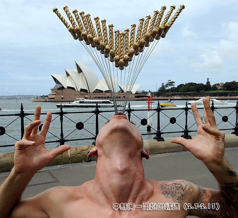 2月8日,街頭藝人Chayne Hultgren在澳大利亞悉尼海港大橋前,一次吞下18把厚約1.3厘米,長(zhǎng)約50.8厘米的長(zhǎng)劍,刷新了吉尼斯世界紀(jì)錄。圖片來源:中國(guó)新聞網(wǎng)>>點(diǎn)擊觀看詳細(xì)內(nèi)容