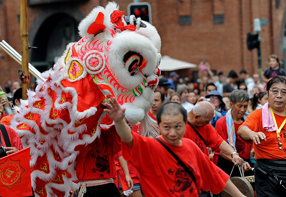 圖為澳大利亞悉尼唐人街上華人社團(tuán)舞獅慶新春。