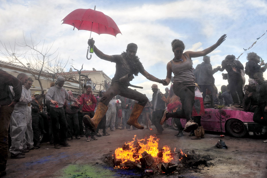 2月15日,希臘港口加拉西迪,狂歡者在街頭參加“面粉大戰(zhàn)”!懊娣鄞髴(zhàn)”是當(dāng)?shù)貞c?駳g季結(jié)束的一項(xiàng)傳統(tǒng)活動(dòng),隨后將是為期40天的齋戒月直至復(fù)活節(jié)。圖片來(lái)源:中國(guó)新聞網(wǎng)