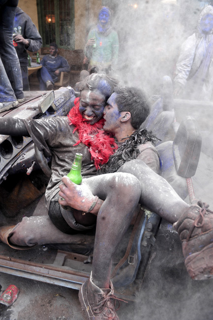 2月15日,希臘港口加拉西迪,狂歡者在街頭參加“面粉大戰(zhàn)”!懊娣鄞髴(zhàn)”是當(dāng)?shù)貞c?駳g季結(jié)束的一項(xiàng)傳統(tǒng)活動(dòng),隨后將是為期40天的齋戒月直至復(fù)活節(jié)。圖片來源:中國新聞網(wǎng)
