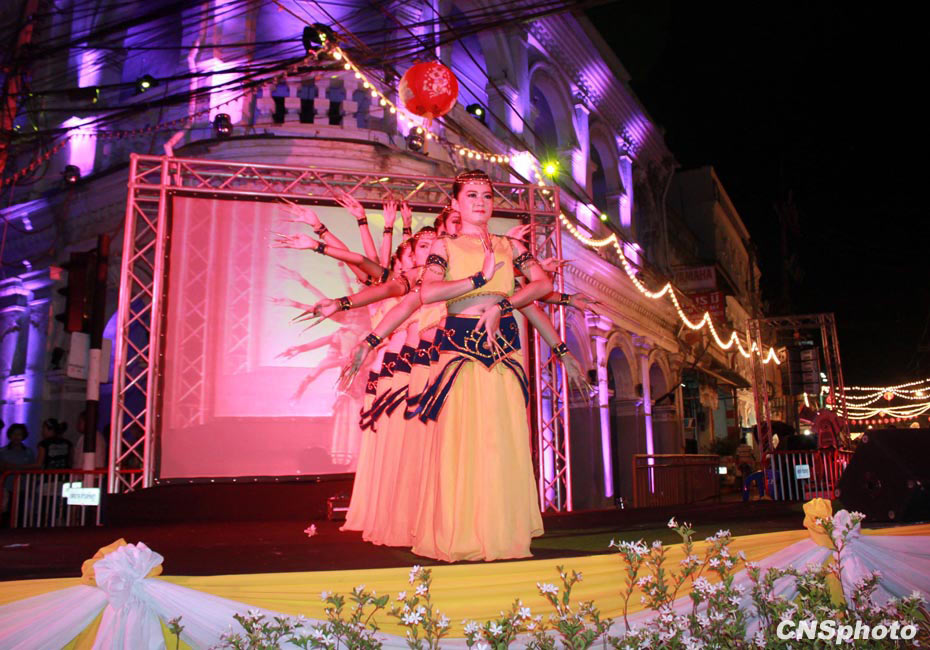 泰國普吉島20日舉辦為期三天的大型活動慶祝中國春節(jié)。普吉中學(xué)孔子課堂應(yīng)邀參加了本次慶祝活動,包括舉辦中華飲食、中國文化工藝品、以及漢語教材為內(nèi)容的展覽。圖為慶;顒又挟(dāng)?shù)貙W(xué)生表演的千手觀音舞蹈。 中新社發(fā) 顧時宏 攝