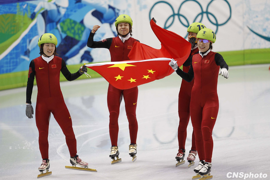 當?shù)貢r間2月24日,溫哥華冬奧會女子短道速滑3000米接力A組決賽中,中國隊王濛、周洋、孫琳琳、張會四朵金花聯(lián)袂出擊,最終將金牌歸入中國隊囊中。圖片來源:中國新聞網(wǎng)