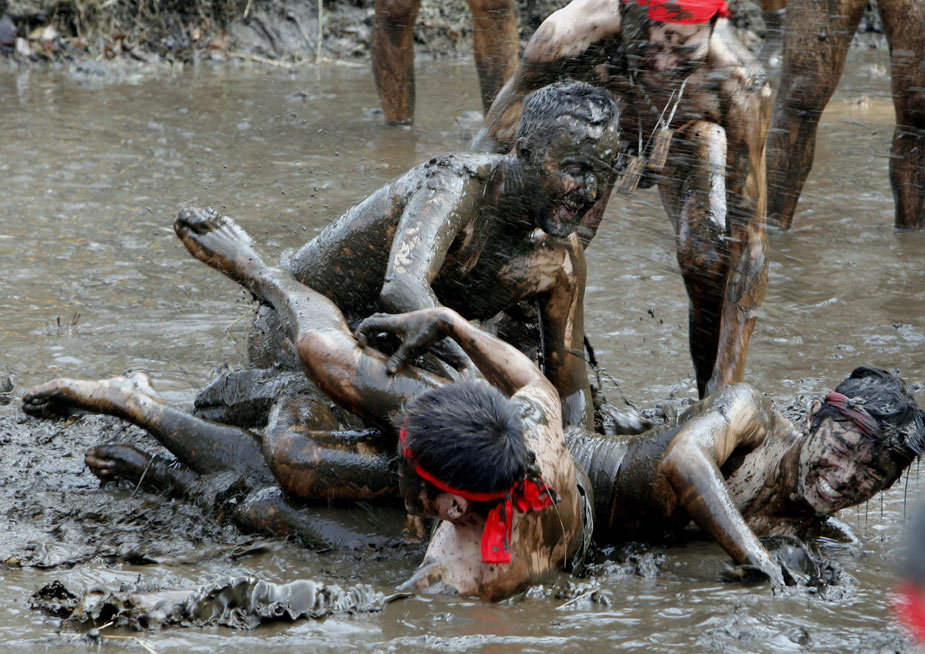 2月25日,在日本千葉縣四街道市郊外的稻田里,居民們參加一年一度的“泥漿節(jié)”。當(dāng)?shù)氐哪凶觽兂嗌硖M(jìn)稻田,把泥漿涂抹在身上。人們希望通過這種儀式祈求新的一年能有個(gè)好收成。