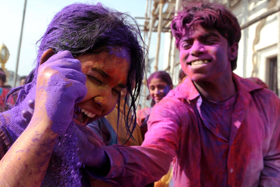 2月28日,印度舉行慶祝灑紅節(jié)活動,人們互撒顏料以示祝福。圖片來源:中國新聞網(wǎng)