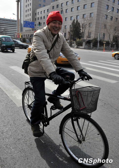 3月2日中午,全國(guó)政協(xié)委員濮存昕騎自行車(chē)去北京國(guó)際飯店,向十一屆政協(xié)三次會(huì)議會(huì)務(wù)組報(bào)到。中新社發(fā) 賈國(guó)榮 攝