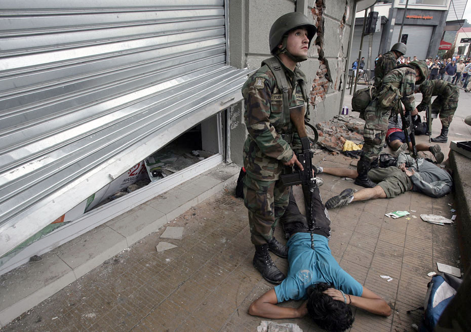 3月2日,智利軍警在街頭維持秩序。智利總統(tǒng)巴切萊特當日說,政府派往災區(qū)維持治安的軍人數(shù)量已達14000人,地震重災區(qū)的搶劫現(xiàn)象已得到控制。圖片來源:中國新聞網(wǎng)