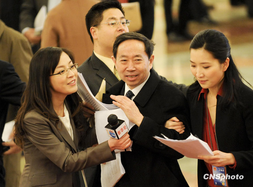 3月5日上午9時(shí),十一屆全國人大三次會(huì)議在北京隆重開幕。國務(wù)院總理溫家寶作政府工作報(bào)告。圖為教育部長袁貴仁進(jìn)場(chǎng)時(shí)受到記者爭(zhēng)相采訪。中新社發(fā) 廖攀 攝