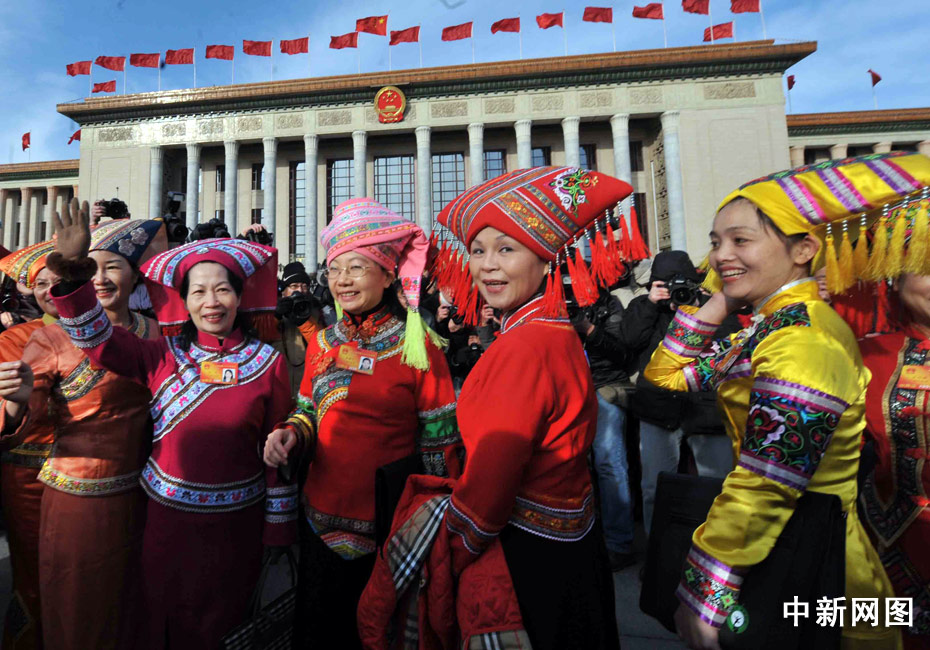 十一屆全國人大三次會議3月5日在北京開幕,各民族人大女代表的服飾靚麗多彩,在天安門廣場前大展英姿。 中新社記者 賈國榮 攝