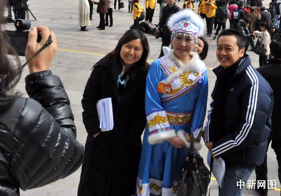 十一屆全國(guó)人大三次會(huì)議3月5日在北京開幕,各民族人大女代表的服飾靚麗多彩,在天安門廣場(chǎng)前大展英姿。 中新社記者 賈國(guó)榮 攝