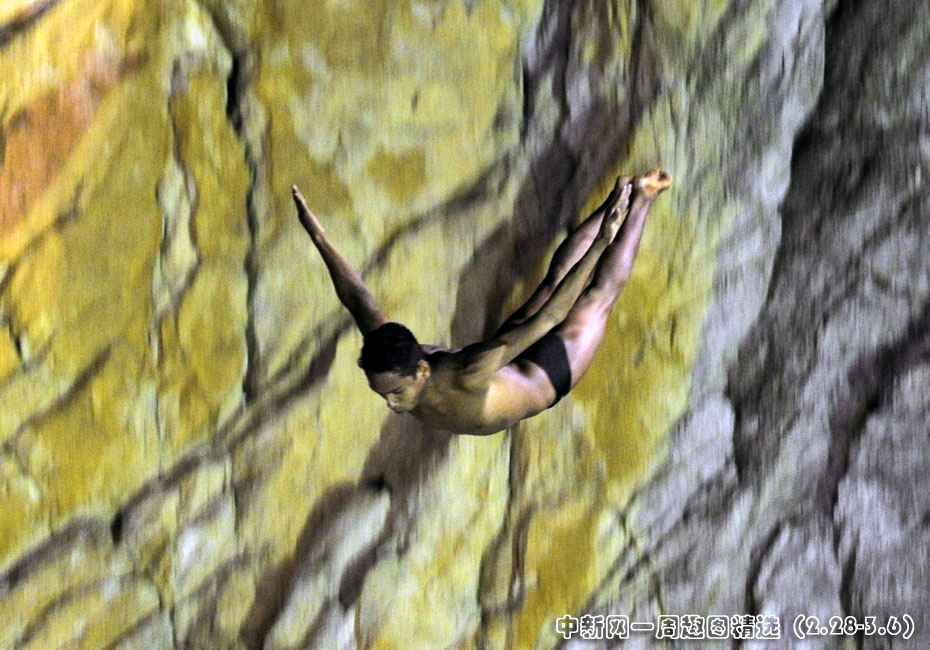 3月1日,墨西哥一名懸崖跳水愛好者手持火把,在該國南部城市阿卡普爾科的“拉·奎布拉達”懸崖上跳水。此種傳統(tǒng)可追溯至1934年。當時,住在阿卡普爾科市的兩位鄰居相互“挑戰(zhàn)”,通過從懸崖上跳向海中來比試各自的勇氣和力量。圖片來源:中國新聞網>>點擊觀看詳細內容