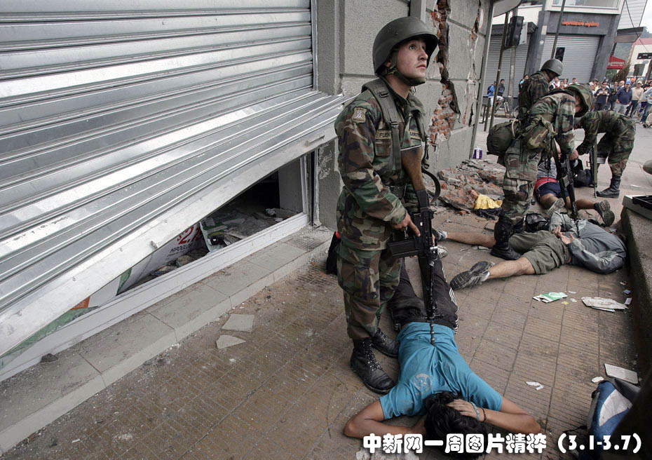 3月2日,智利軍警在街頭維持秩序。智利總統(tǒng)巴切萊特當日說,政府派往災區(qū)維持治安的軍人數(shù)量已達14000人,地震重災區(qū)的搶劫現(xiàn)象已得到控制。圖片來源:中國新聞網(wǎng)