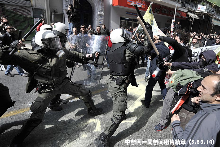 周四,希臘雅典的罷工者與防暴警察發(fā)生沖突。圖片來(lái)源:中國(guó)新聞網(wǎng)