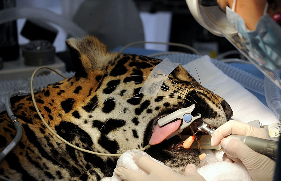 3月13日,在哥倫比亞麥德林附近的一個(gè)獸醫(yī)診所,一只雌性美洲虎在接受牙齒手術(shù)。圖片來源:中國新聞網(wǎng)
