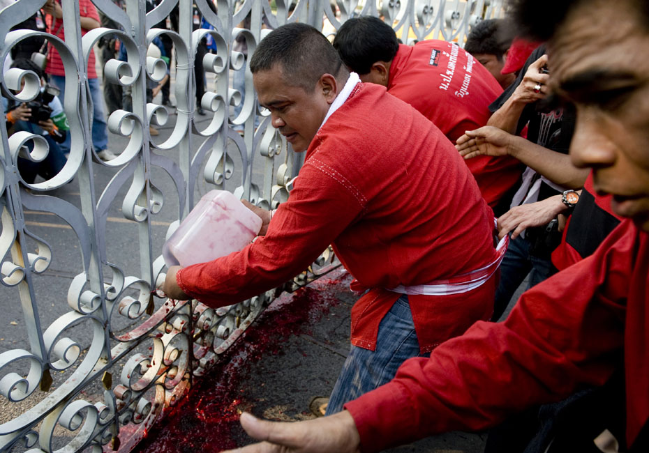 泰國反政府組織“紅衫軍”成員將血液潑灑在曼谷總理府門前,以此向政府施壓要求解散國會下議院。圖片來源:中國新聞網(wǎng)