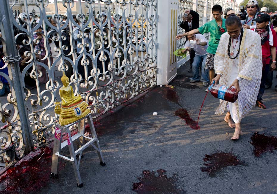 泰國反政府組織“紅衫軍”成員將血液潑灑在曼谷總理府門前,以此向政府施壓要求解散國會下議院。圖片來源:中國新聞網(wǎng)