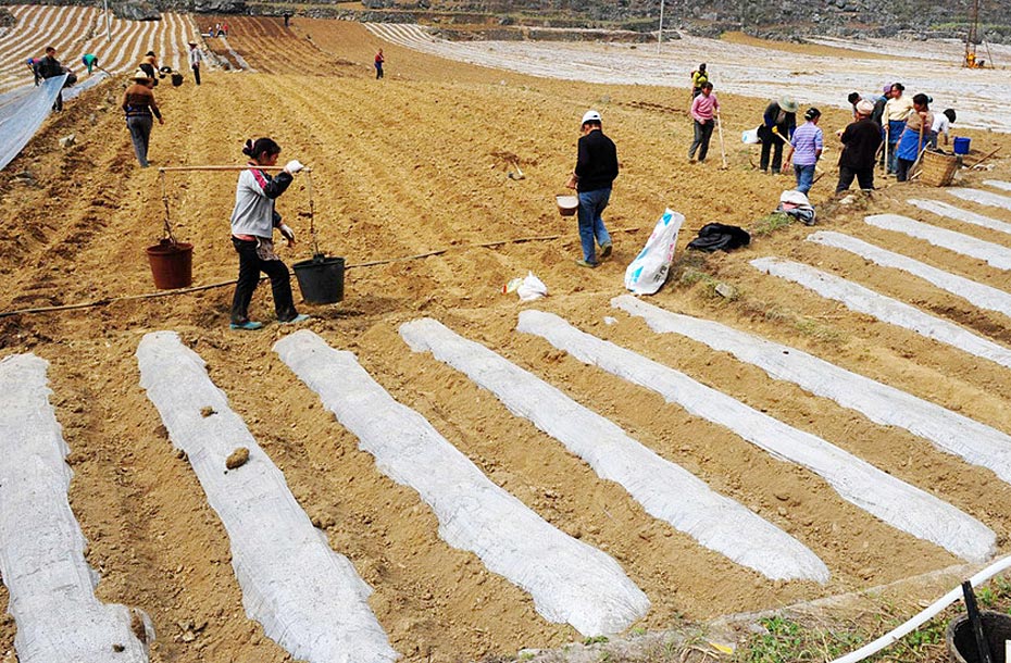 3月14日,貴州省長順縣宂雷村村民正在加緊補(bǔ)種早熟玉米,并利用覆膜技術(shù)保持土壤水分。圖片來源:新華網(wǎng) 劉續(xù) 攝