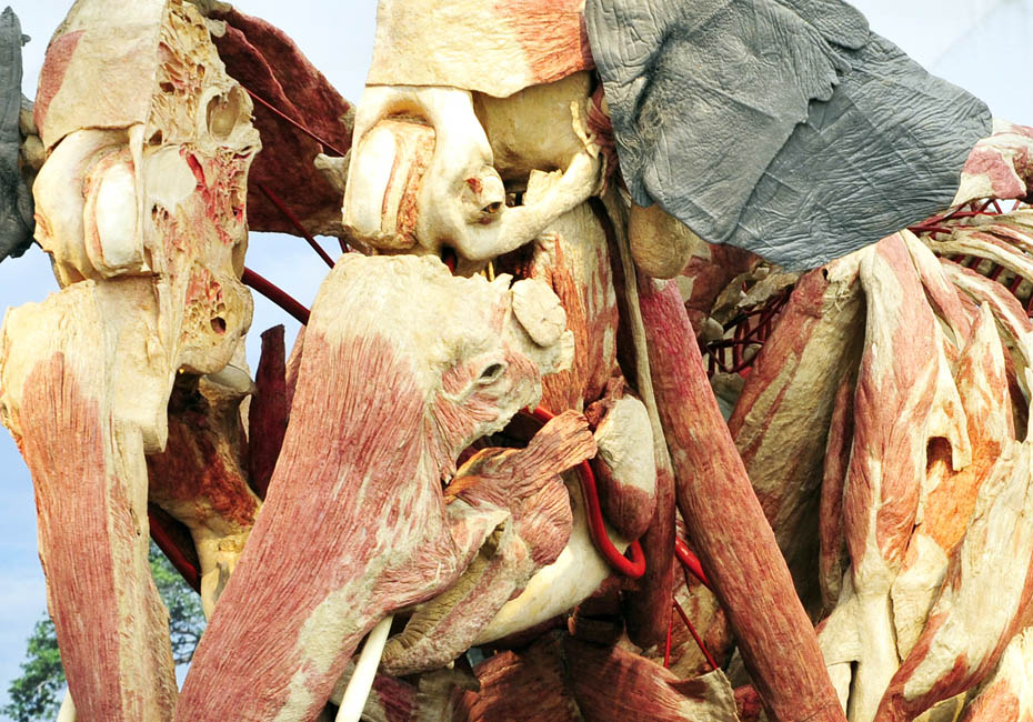 德國著名解剖學(xué)家鞏特爾·馮·哈根斯博士被稱為“死亡先生”,目前展出的是有史以來的最大的動(dòng)物尸體。體型巨大的“桑芭”尸體高3.5米,重3.2噸。據(jù)悉“桑芭”將于2010年4月歸還諾因基興動(dòng)物園。圖片來源:中國新聞網(wǎng)