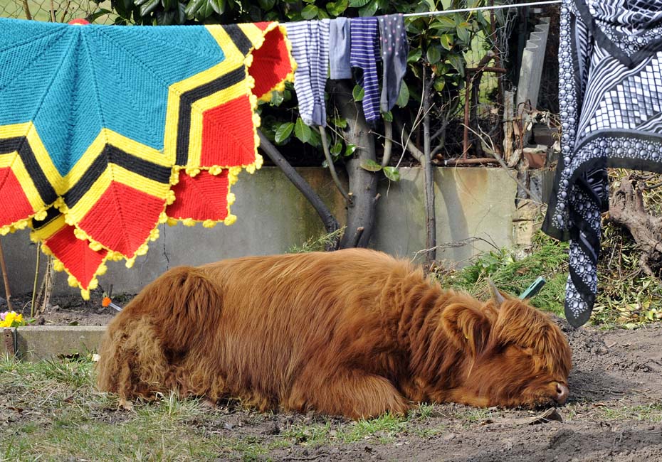 3月18日,德國一頭蘇格蘭高地牛來到一居民院內(nèi)懶洋洋的曬太陽,最后經(jīng)過獸醫(yī)的麻醉和消防員協(xié)力才將這頭蠻力十足的家伙“制服”。圖片來源:中國新聞網(wǎng)