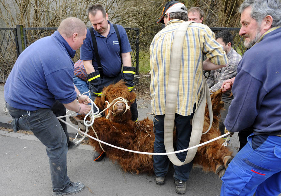 3月18日,德國(guó)一頭蘇格蘭高地牛來(lái)到一居民院內(nèi)懶洋洋的曬太陽(yáng),最后經(jīng)過(guò)獸醫(yī)的麻醉和消防員協(xié)力才將這頭蠻力十足的家伙“制服”。圖片來(lái)源:中國(guó)新聞網(wǎng)